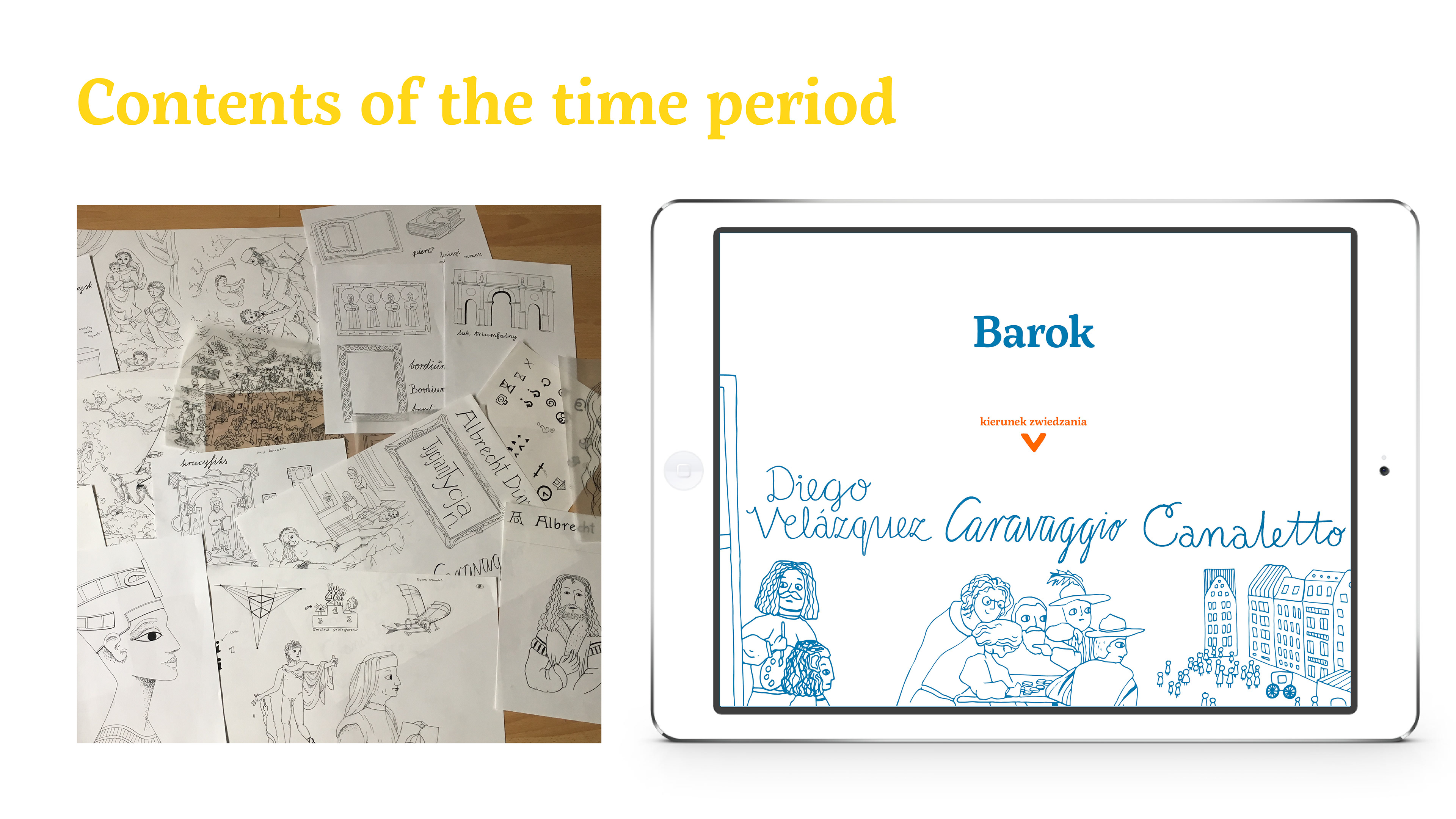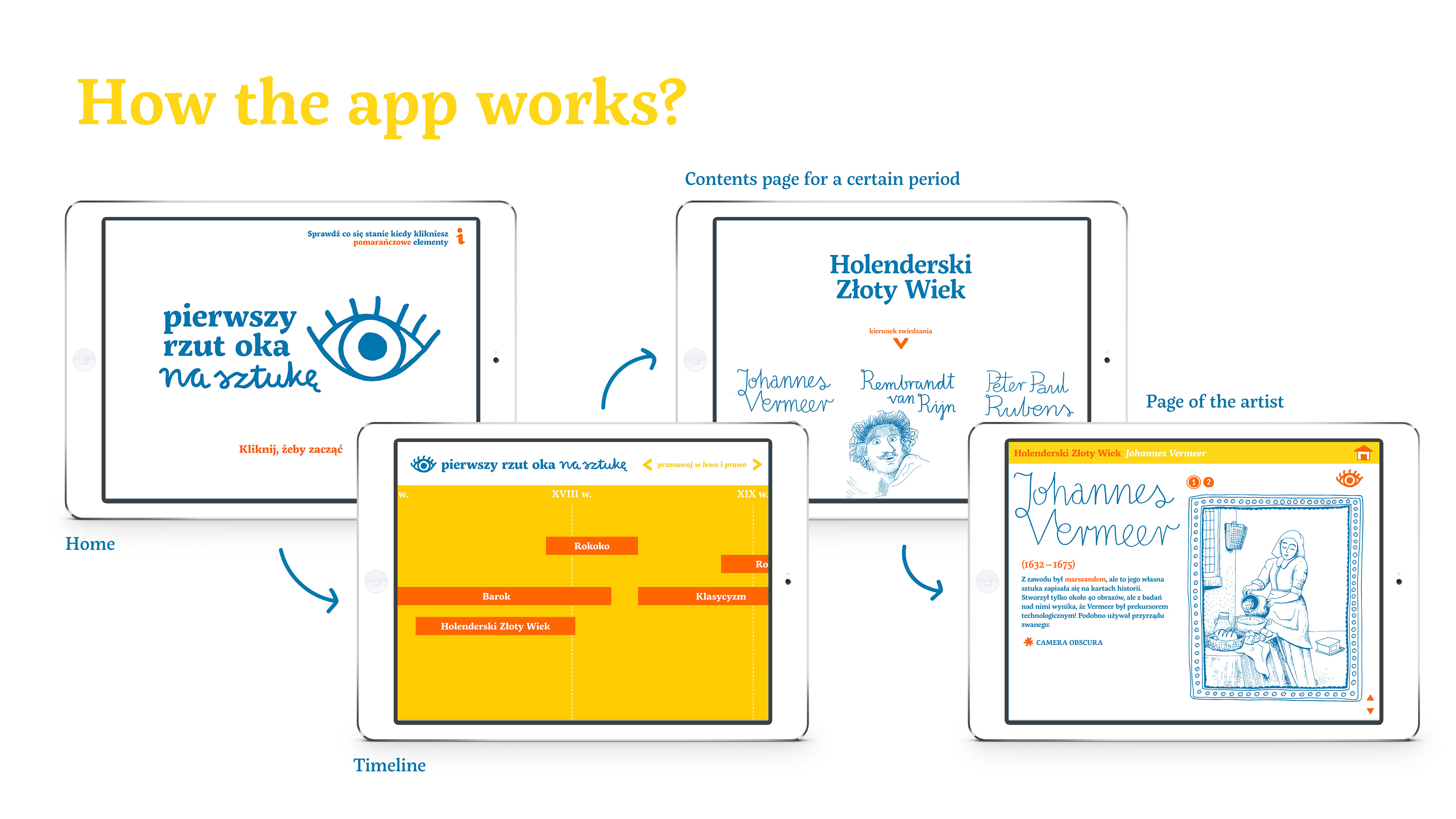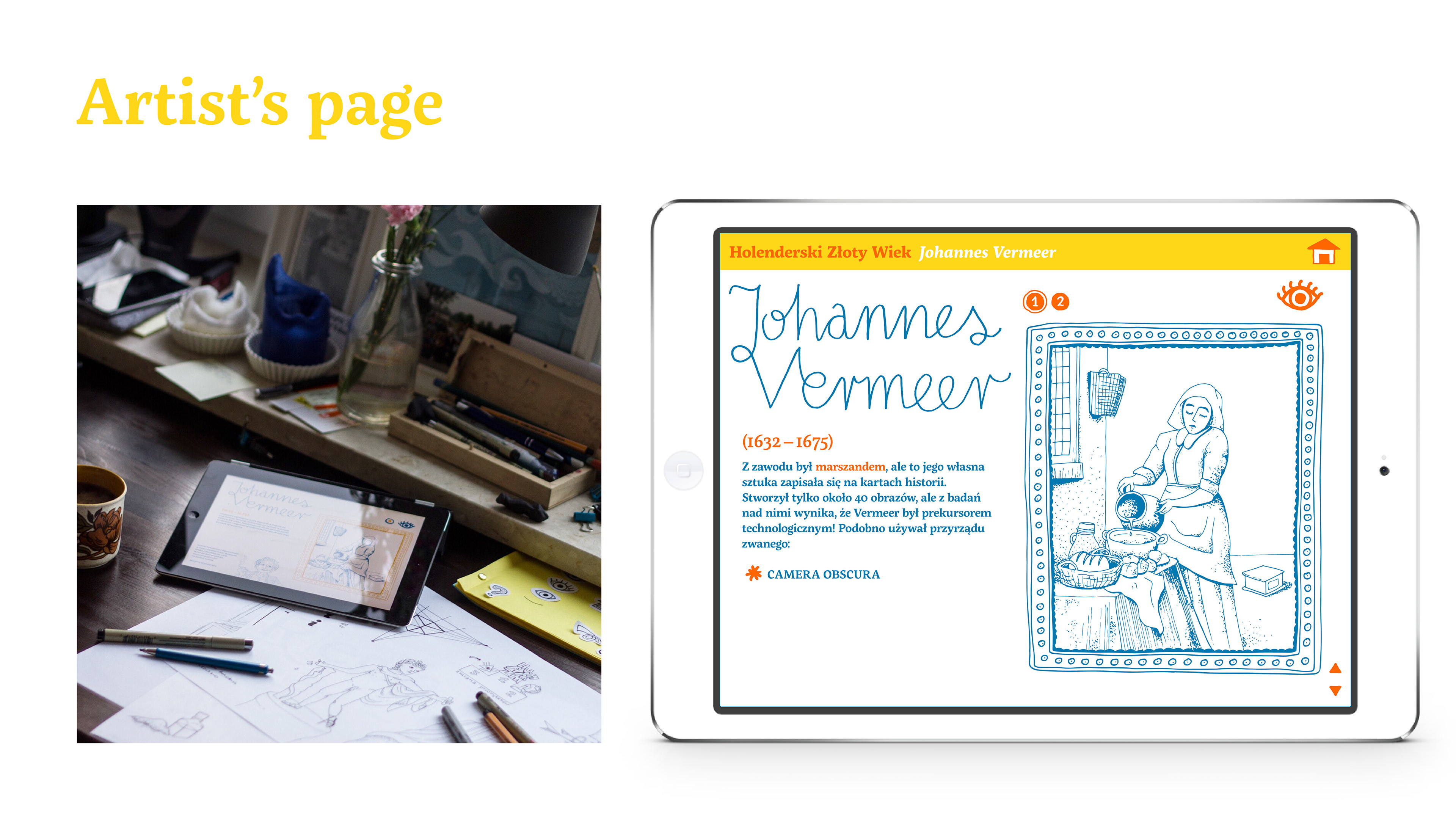 It's an app that includes print-at-home activity sheets, colouring book and a set of posters. The idea behind the app is very simple - a timeline, 3-8 artists per art period and a lot of pieces of art and connections between them. This last part is the most interesting to show, because it creates a lot of options to discover non-obvious connections between pieces of art.
