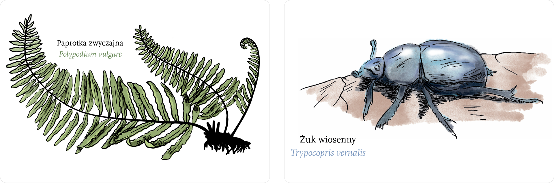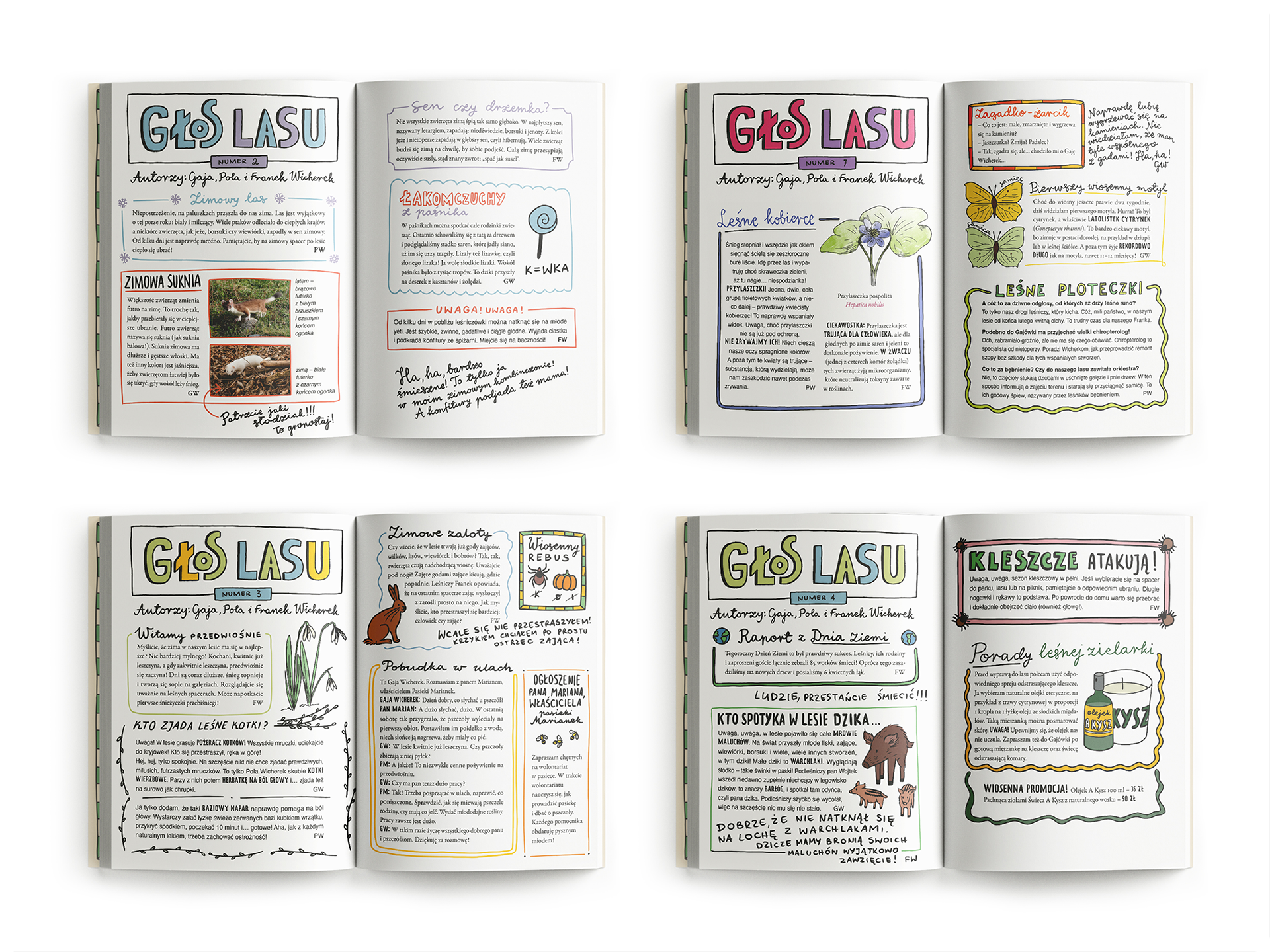 Sometimes there are illustrations by her mother, such as delicate watercolours depicting specific species of animals. I also created pages showing "forest paper" written by Gaja and her parents together, and an "animal atlas" showing details about the animals she met. There are also some notes from the lessons she has at home.
