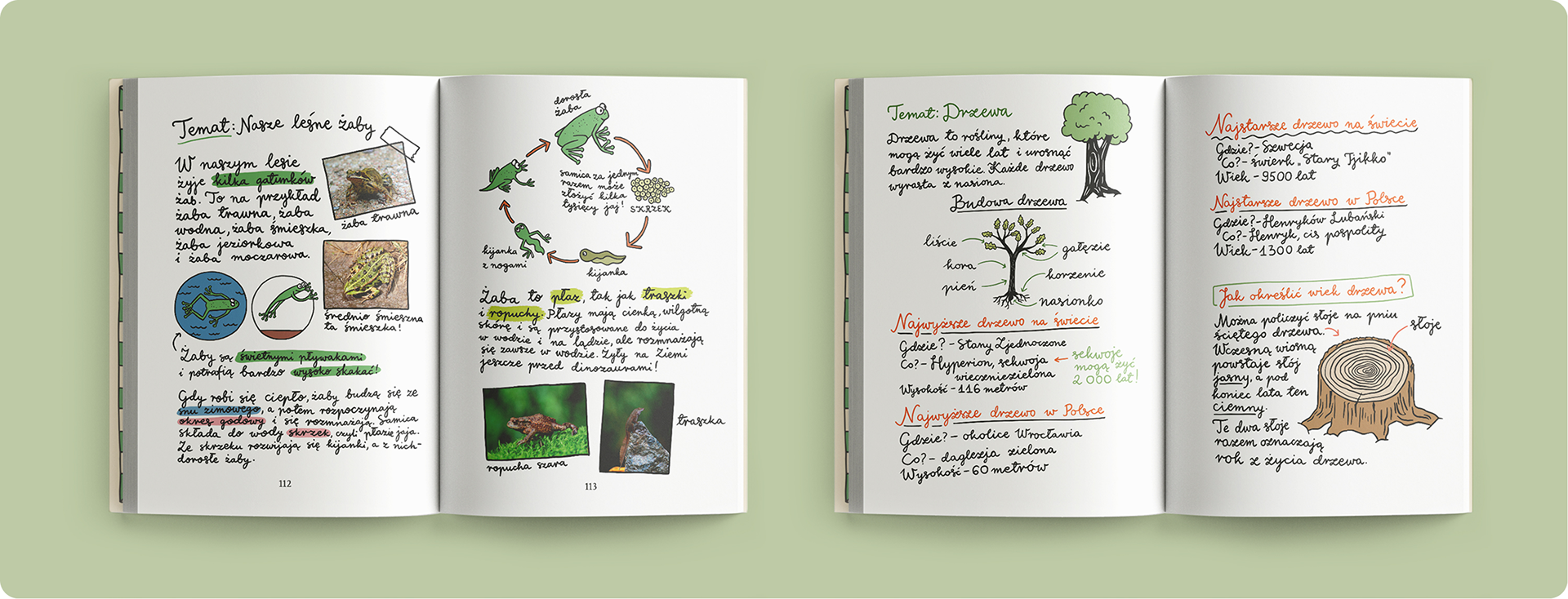 The main character, Gaja, is homeschooled by her mum. Some pages contain her notes from lessons on topics such as trees, frogs and books – those pages are all hand-written to indicate that they are Gaja’s notes.