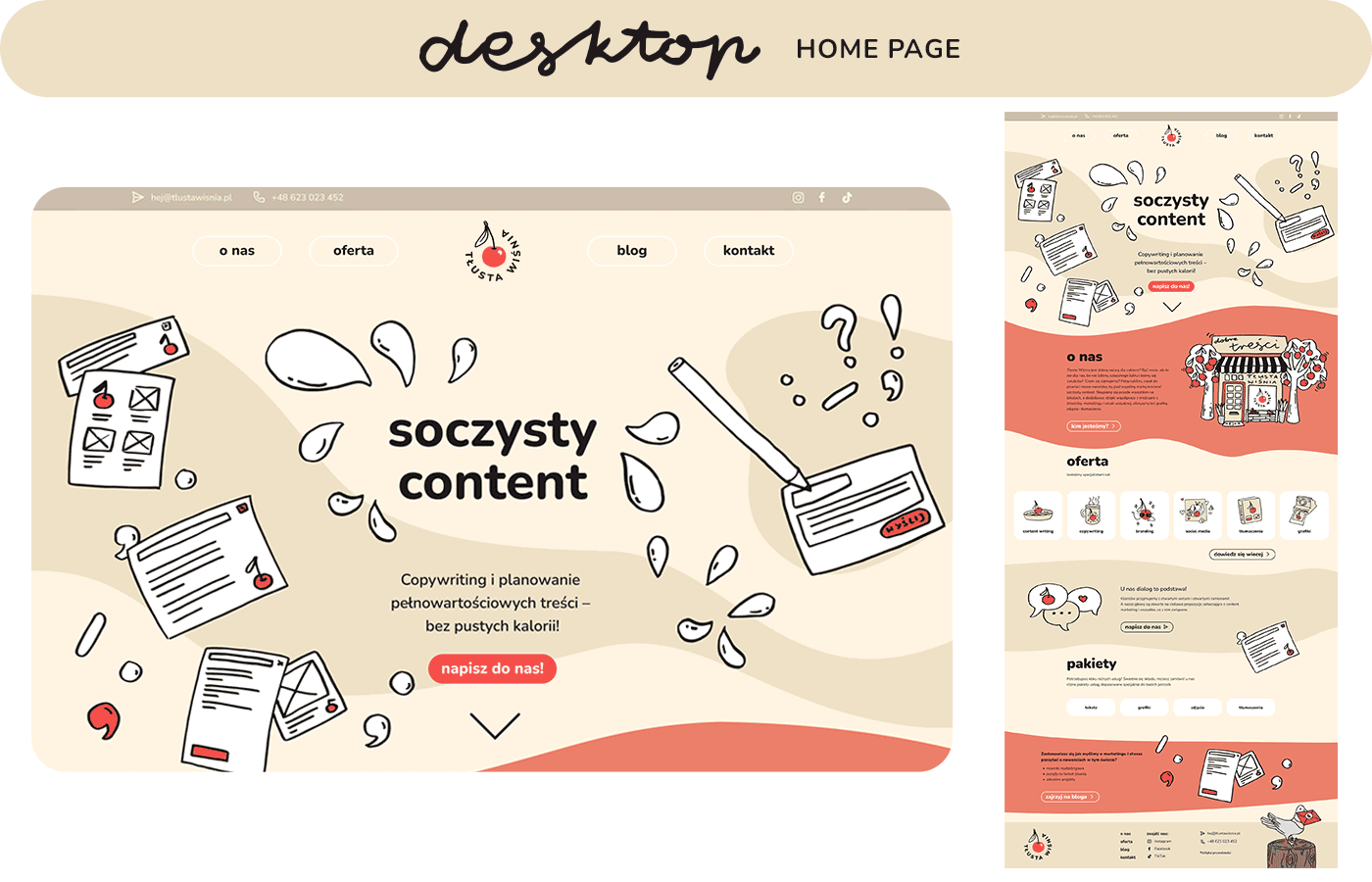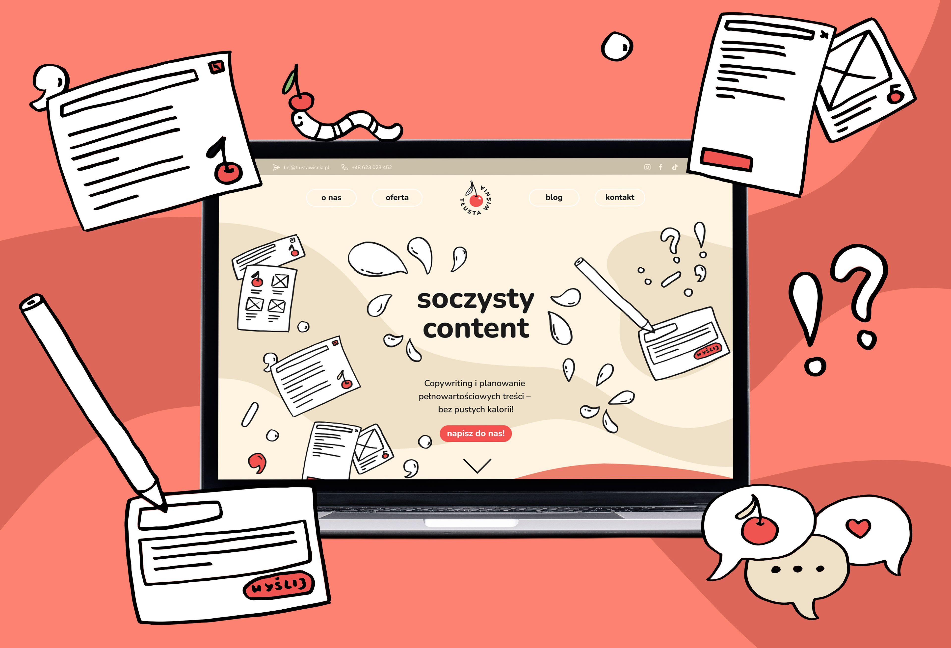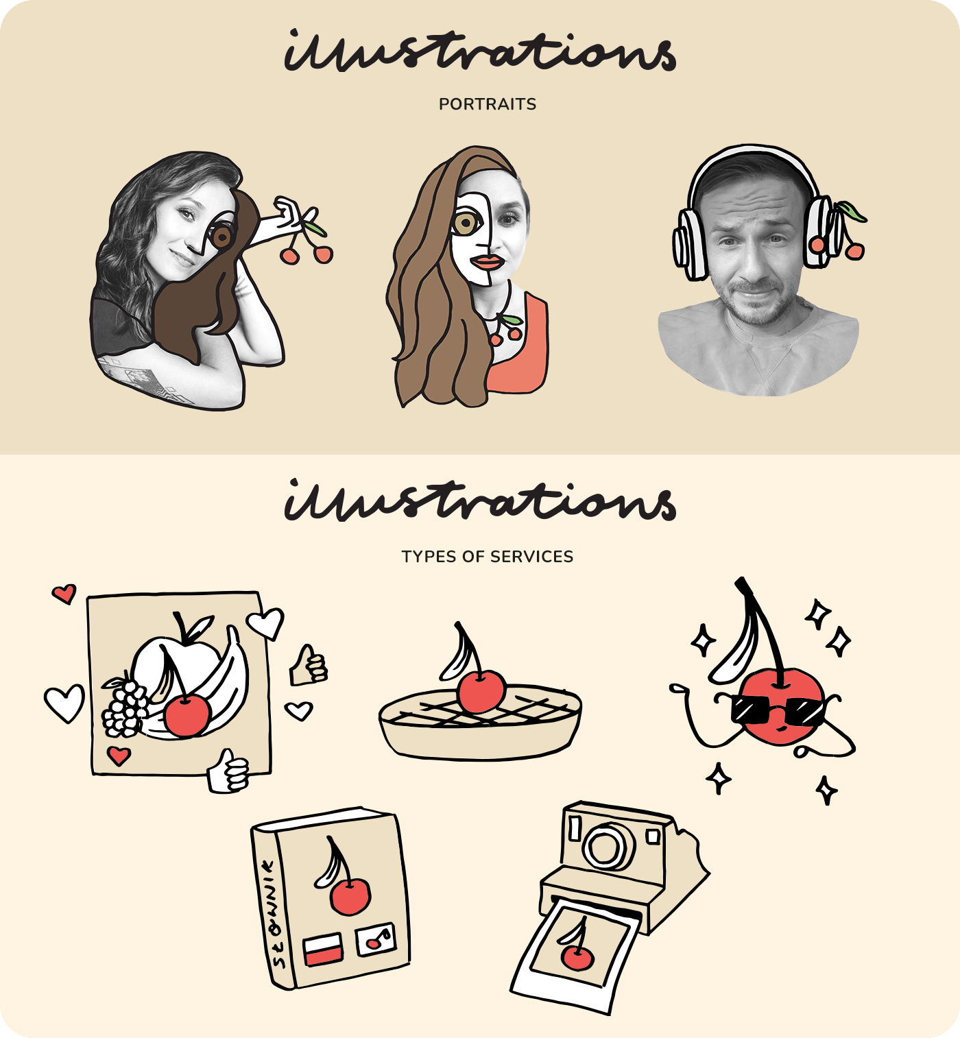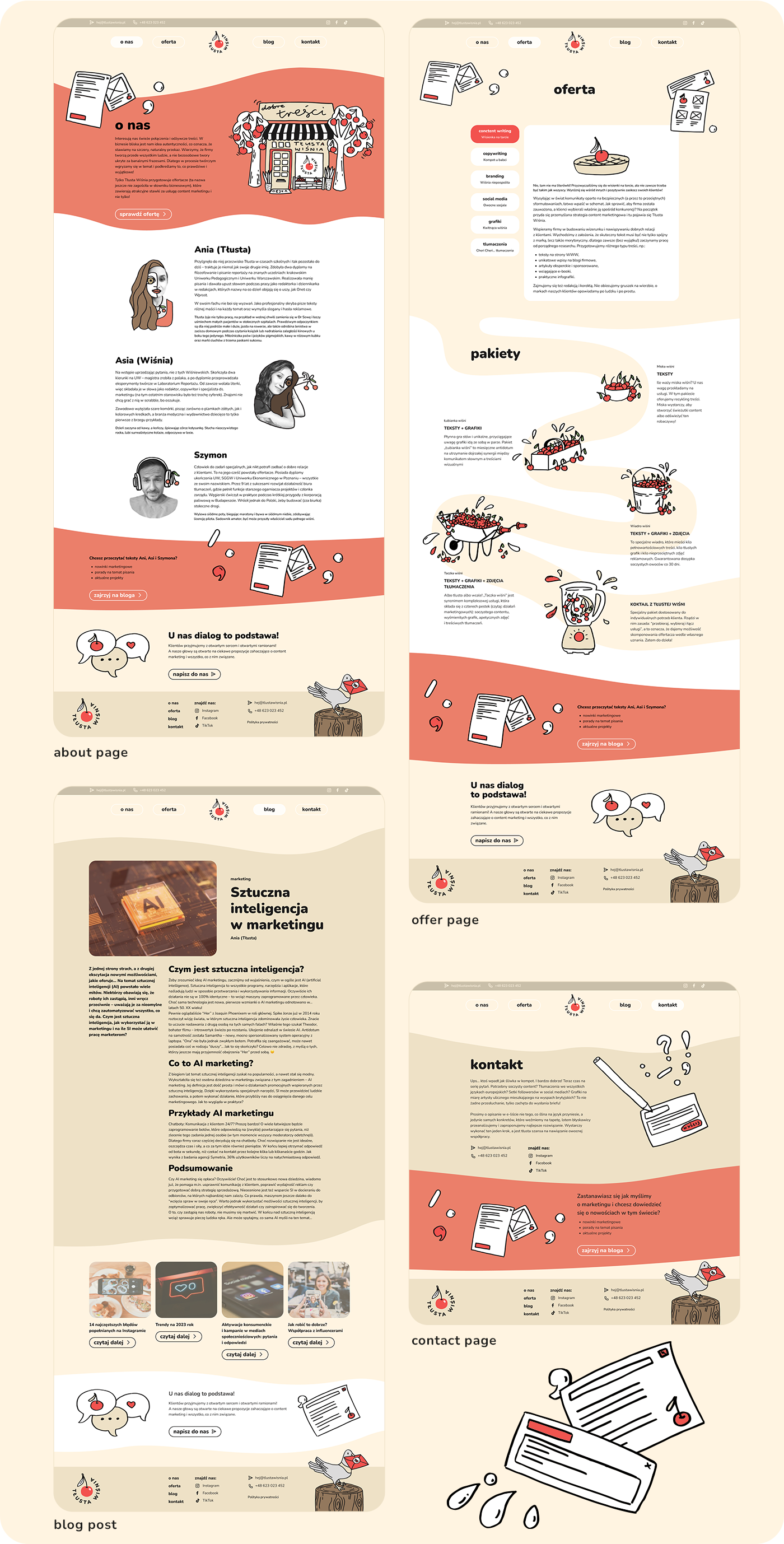 Tłusta wiśnia (polish for "fat cherry") is a brand of creatives focused on content creation and copywriting. The name is a joke that started with creator's last names. They wanted their branding to be cheerful and fun, but also conveying what is it that they actually do best – words.