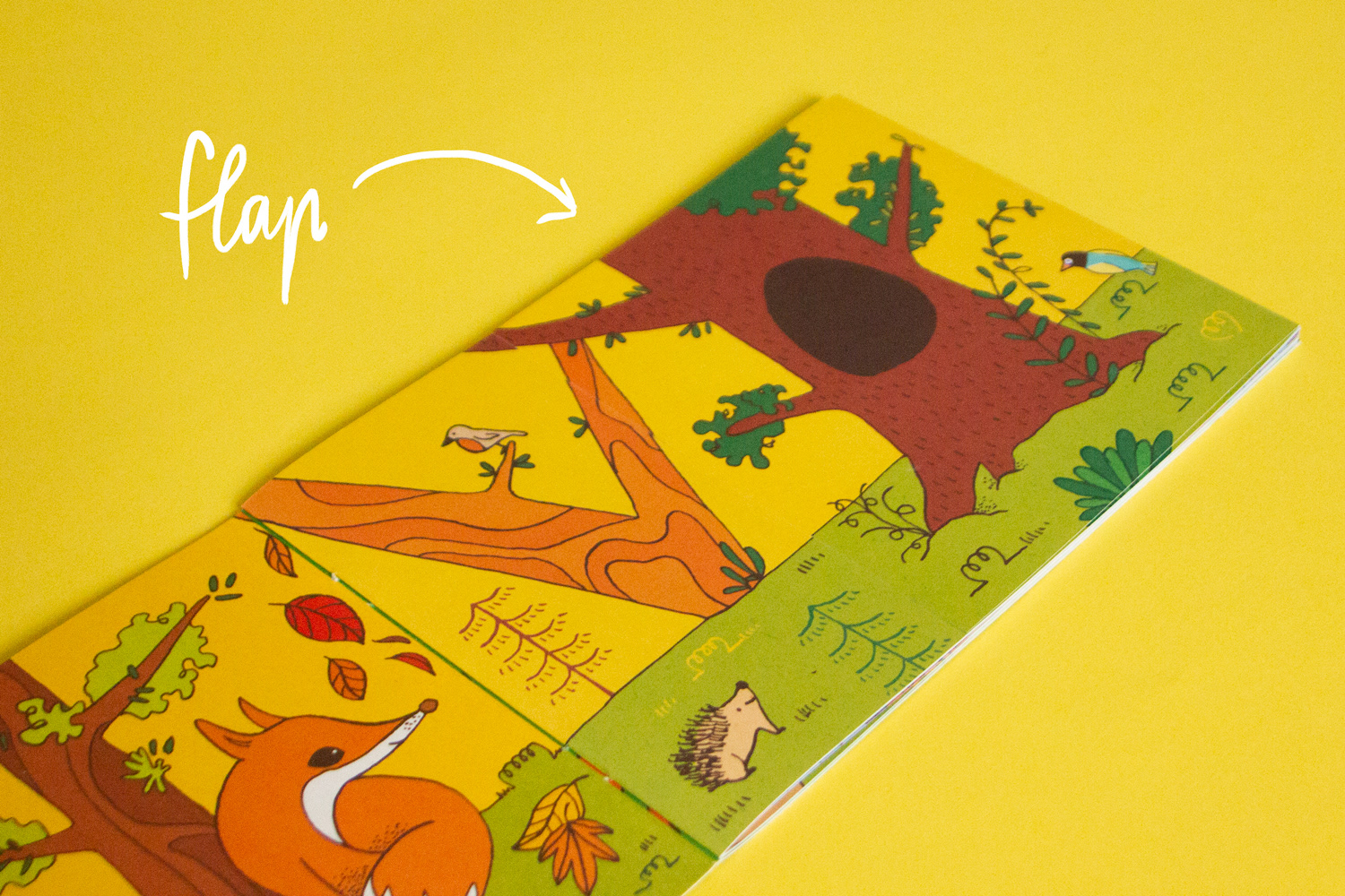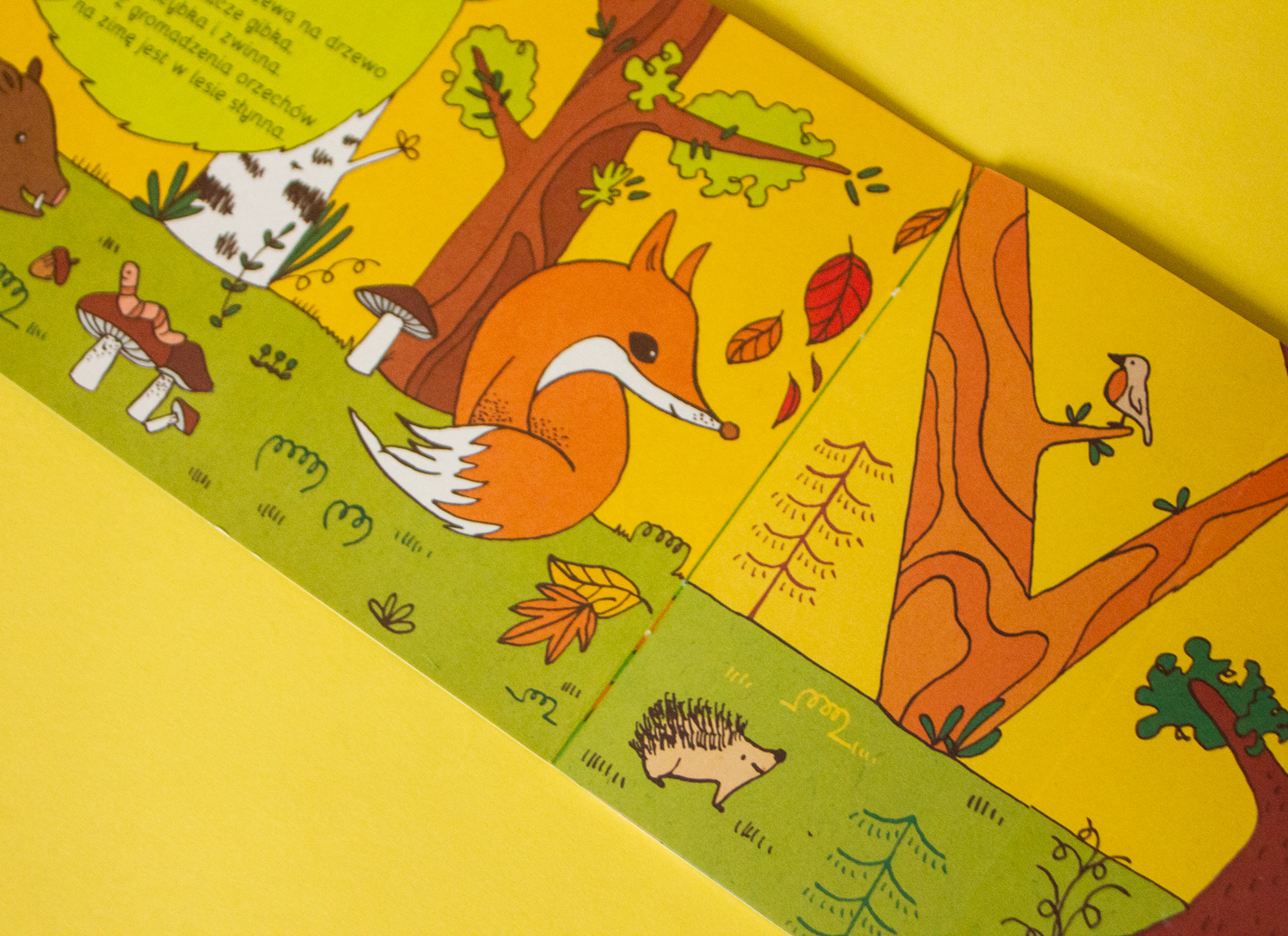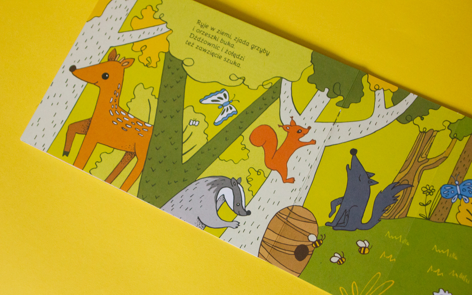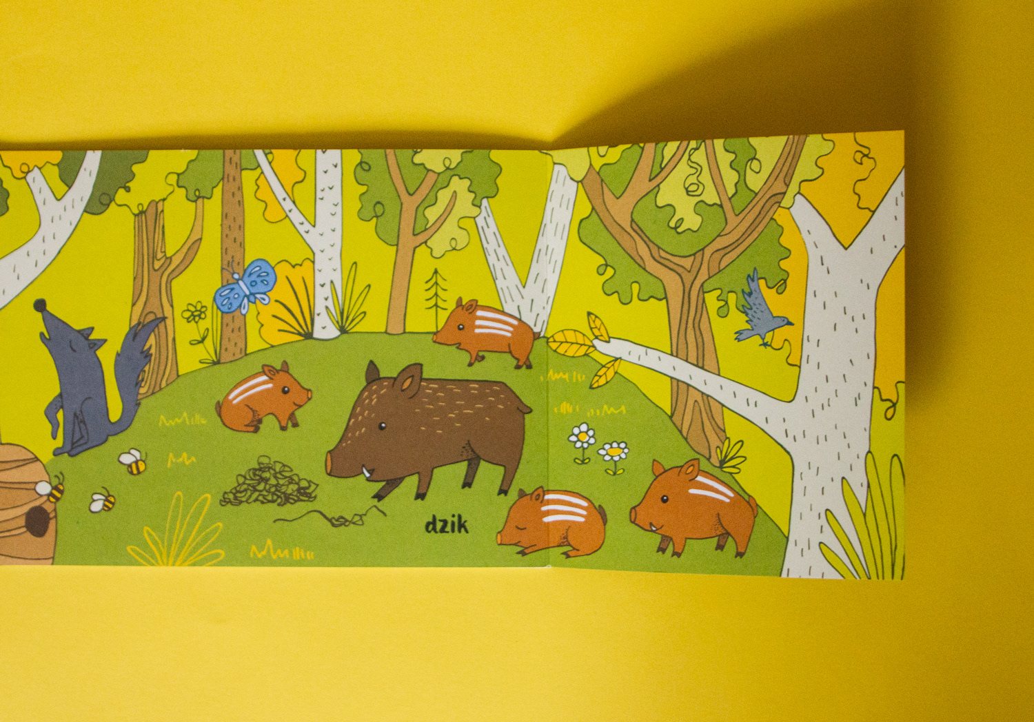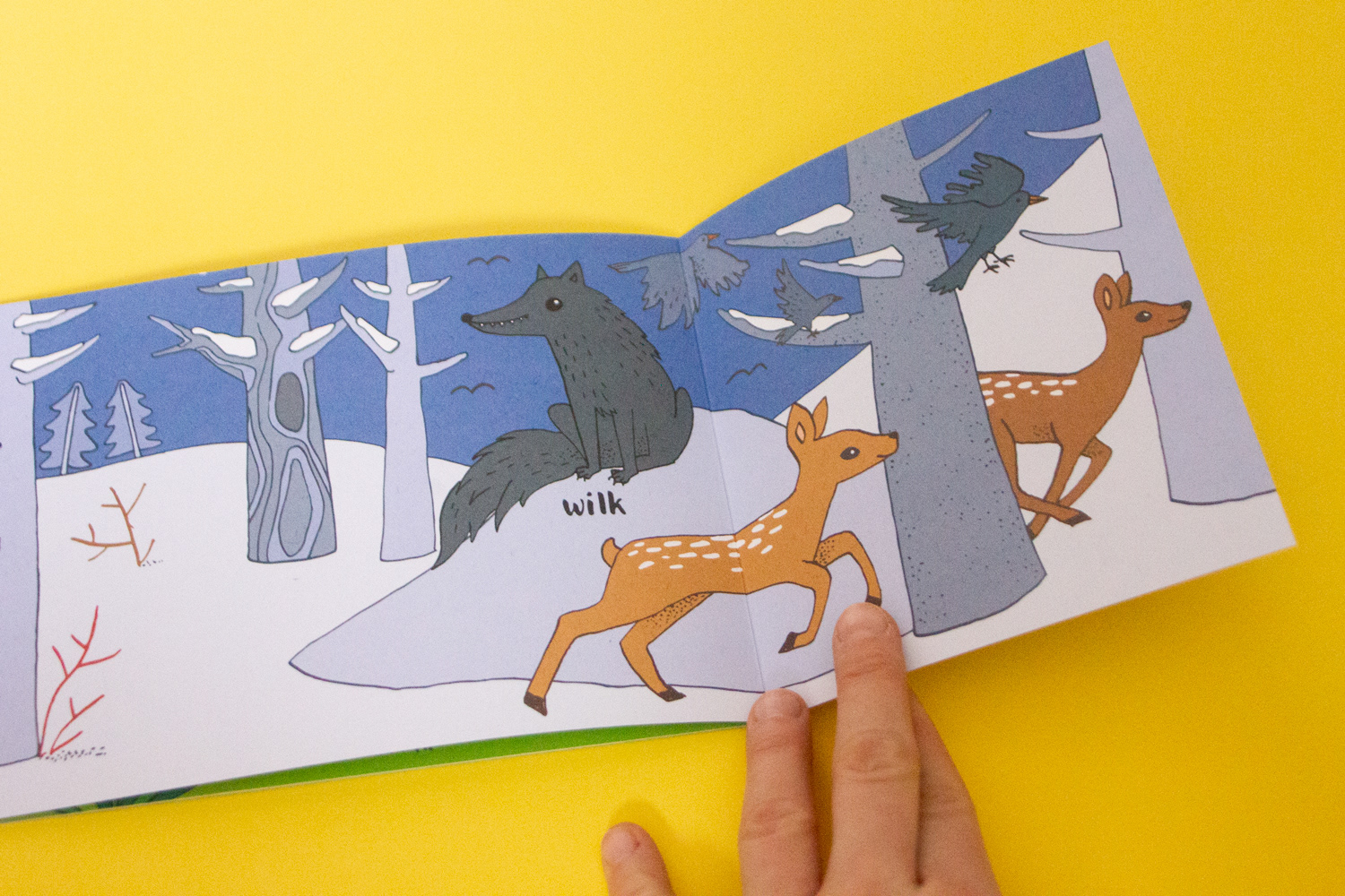 Illustrations with forest animals and little riddles about them. Book has flaps, so that the child can guess an animal and than uncover the flap to find out the correct answer.
